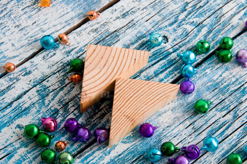 Дерево деревянных треугольников на синем фоне доски, вид сверху, пространство для копирования, яркие колокольчики