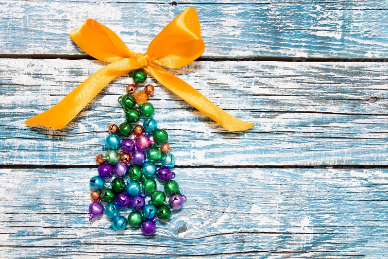 Треугольный поддерживается яркими блестящими клеями, дерево маленьких колокольчиков на синем деревянном фоне, пространство для копирования, вид сверху, новый год, рождество, поздравление