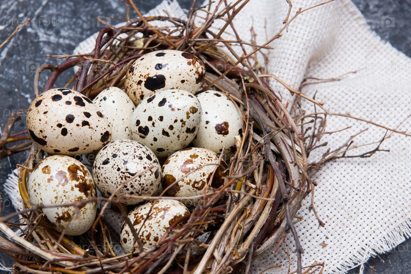 Перепелиные яйца в гнезде из веток с лавровым листом на темном фоне