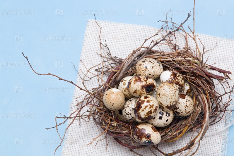 Перепелиные яйца в гнезде ветвей на синем фоне, светлая ткань, пасхальный фон, натуральная пища, пространство для копирования, вид сверху