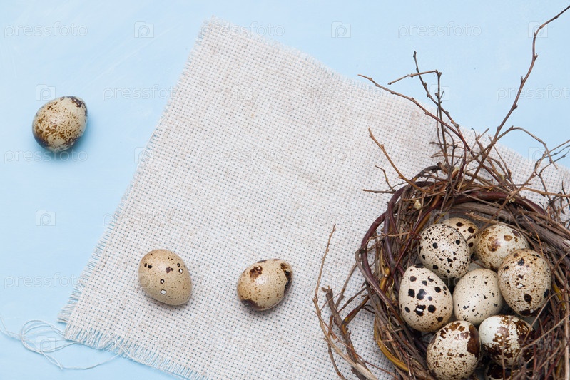 Перепелиные яйца в гнезде ветвей на синем фоне, светлая ткань, пасхальный фон, натуральная пища, пространство для копирования, вид сверху