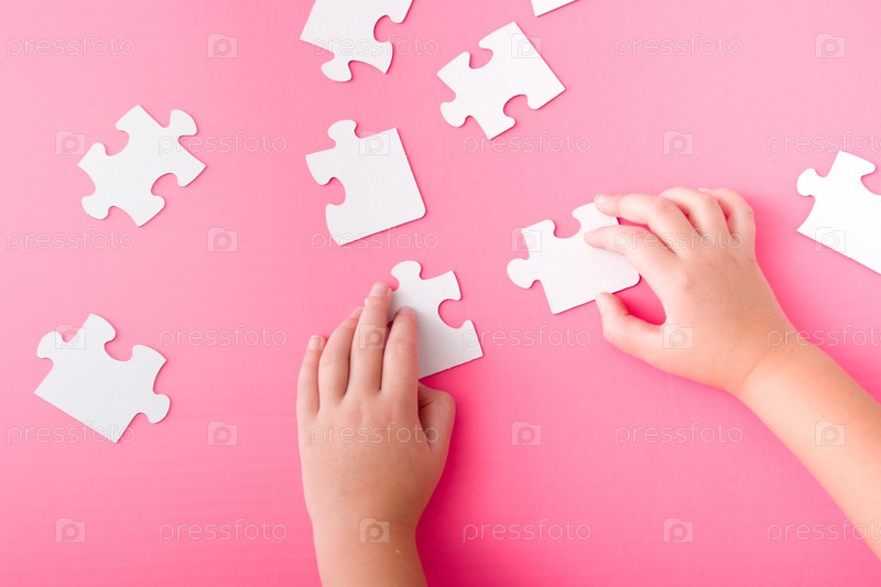 Детские руки складывают бумажную белую головоломку на розовом фоне