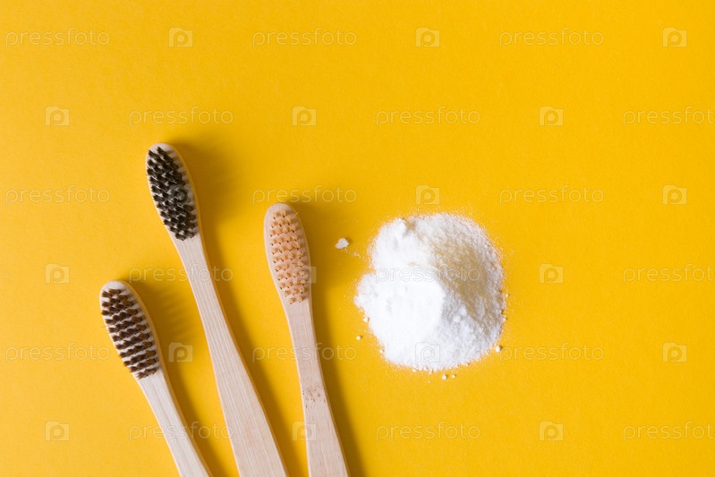 Несколько различных зубных щетки из бамбука и куча соды на желтом фоне копируют вид сверху, концепцию чистки зубов sodry, концепцию образа жизни без отходов