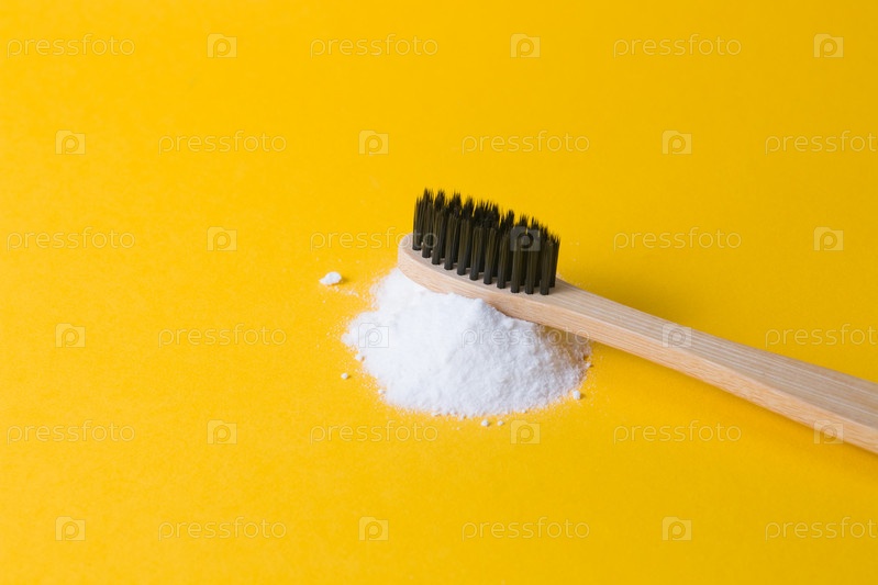 Бамбуковая зубная щетка на куче соды на желтом фоне копирует чистку зубов концепция газировки, концепция образа жизни без отходов