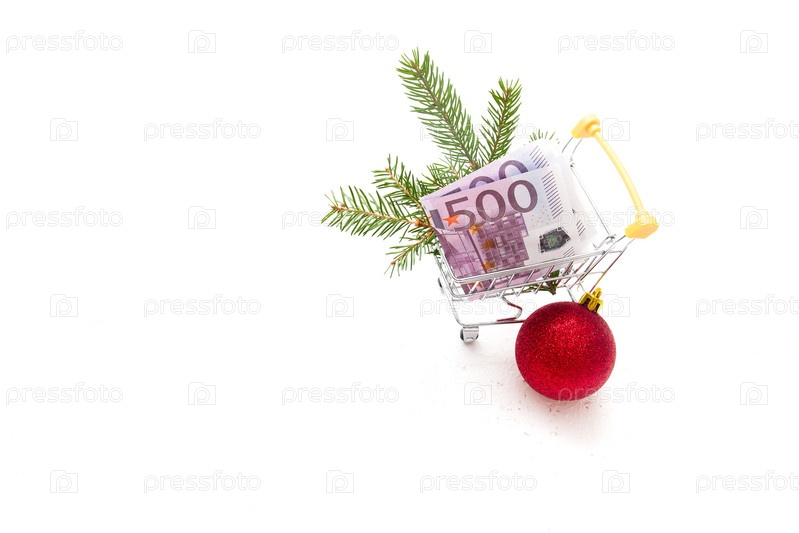 Концепция покупок перед Рождеством, новогодний декор и купюра в 500 евро в тележке для покупок на белом фоне
