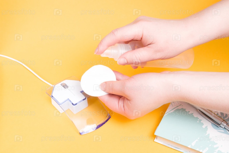 Женская рука наносит антисептик на ватный диск, чтобы вытереть компьютерную мышь, пространство для копирования на желтом фоне, гигиена на рабочем месте, оставайтесь дома, концепция удаленной работы