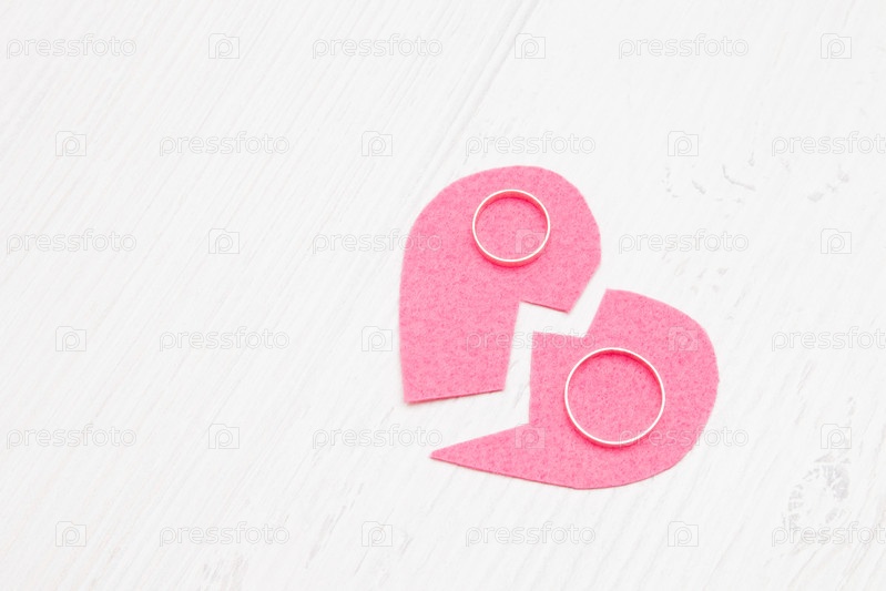 Вырезать сердце из войлока и обручальных колец, развод, разбитое сердце, развод, светлый фон, пространство для копирования