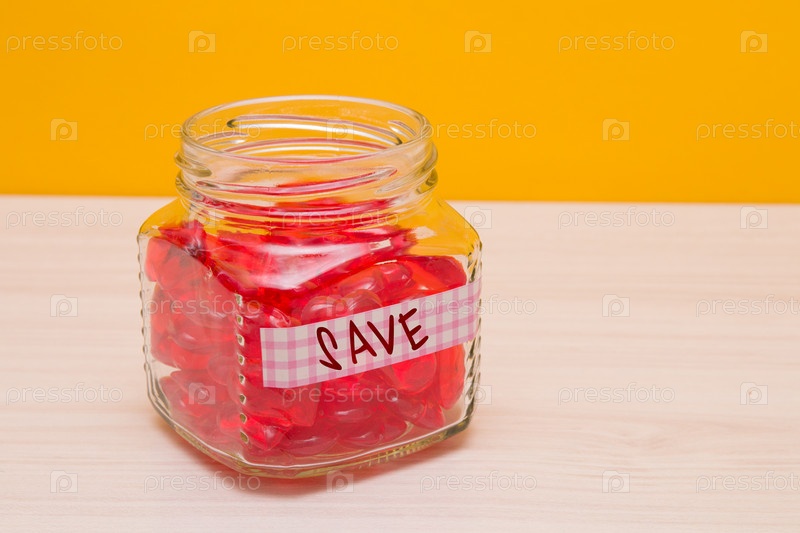 Банка с сердечками на столе, надпись сохранить на банке, желтый фон, концепция благотворительности и бескорыстной помощи