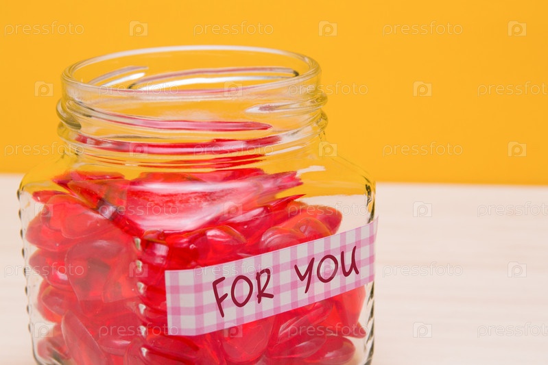 Банка с сердечками на столе, розовая наклейка с надписью для вас на банке, желтый фон, концепция любви, день святого валентина, открытка ко дню матери