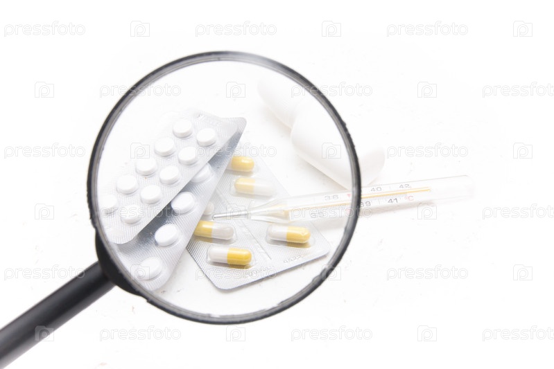 Лекарства под увеличительным стеклом, поиск лекарств, смертельные лекарства, поиск лечения, белый фон, место для копирования