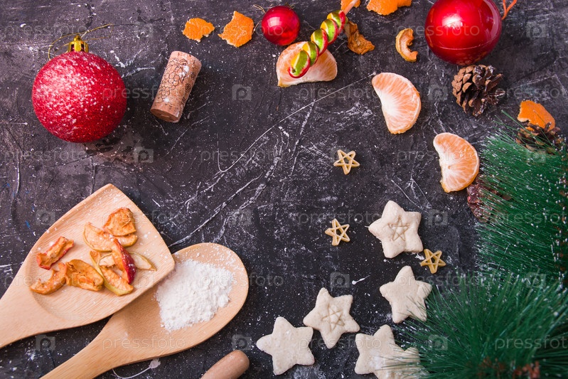 Печенье в форме звезды на Новый год, Рождество, выпечка, кухонная утварь, шпатель, елка, елочные шары, шишки, мандарин на черном текстурированном фоне, пространство для копирования, вид сверху