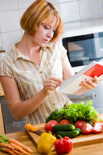 Девушка читает кулинарную книгу рядом с кучей овощей