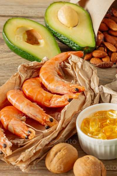 Концепция здорового питания. Природные источники омега-3 кислот. Овощи, морепродукты, орехи и семена