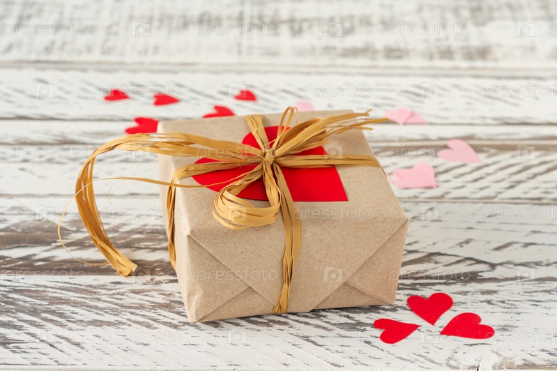 Бумажная подарочная коробка в стиле ремесла с бантом из шнура и красными сердцами на деревянном фоне. Праздничная открытка на день Святого Валентина и день рождения