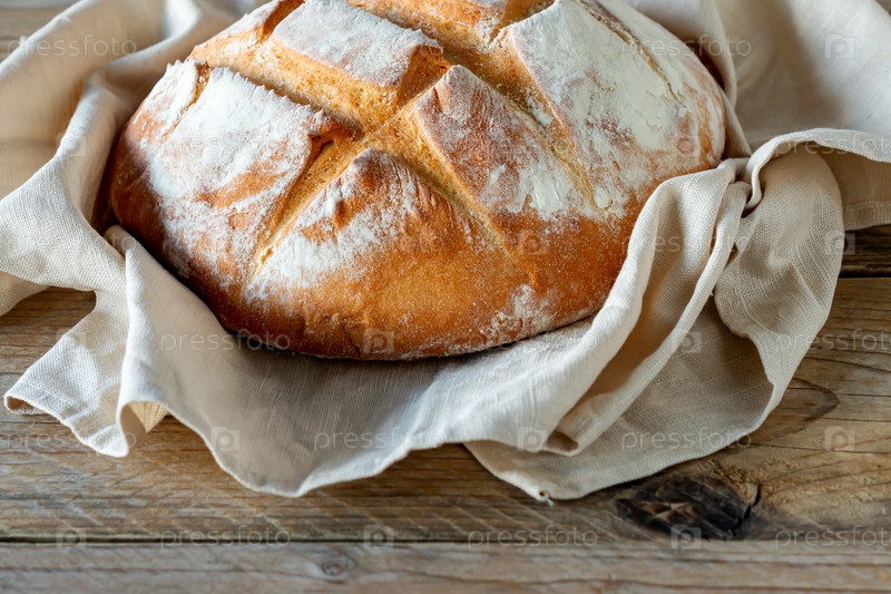 Свежеиспеченный хлеб на деревянном сером кухонном столе, домашняя выпечка