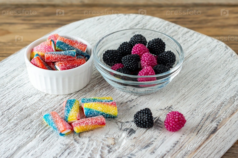 Разноцветные жевательные мармеладные конфеты в мисках на деревянной разделочной доске