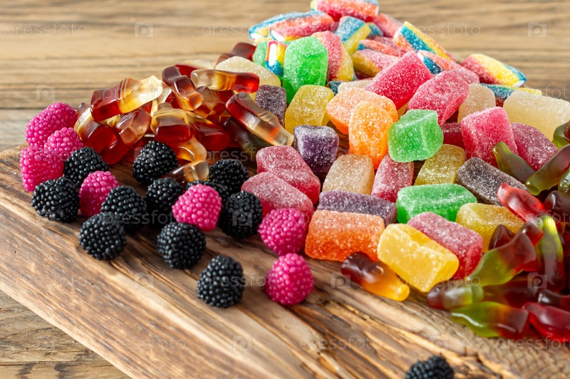 Фруктовые мармеладные конфеты, желейные конфеты на деревянном столе. Фруктовый натуральный десерт с сахаром