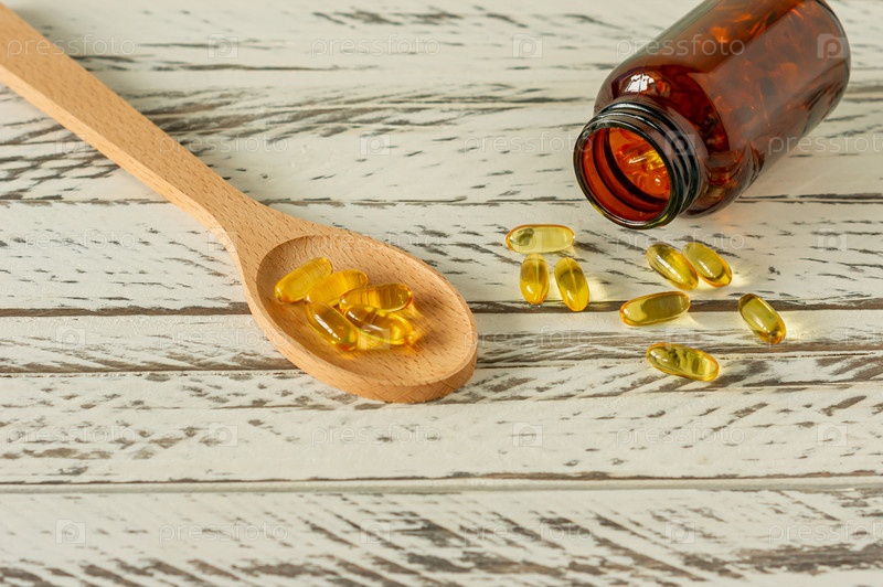 Капсулы с рыбьим жиром на деревянном фоне и текстуре, витамин D, омега-добавка, селективный фокус