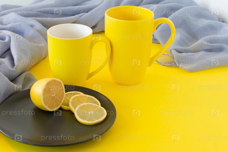 Две желтые кружки и нарезанный лимон на черной тарелке с копией пространства. Модные цвета 2021 года. Сияющий желтый и окончательный серый