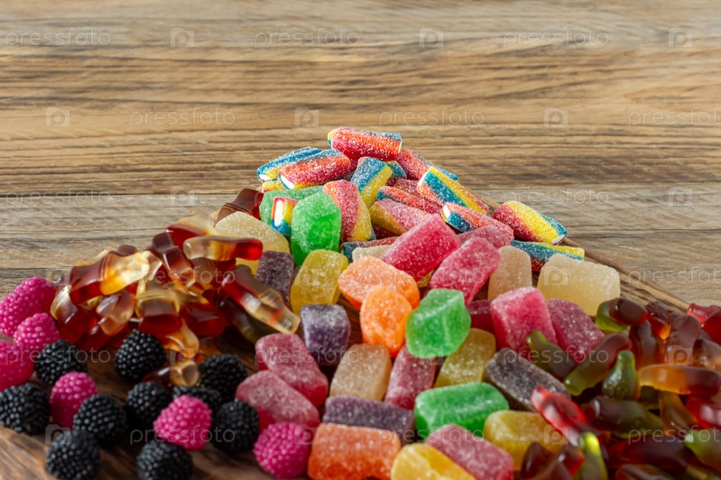 Фруктовые мармеладные конфеты, желейные конфеты на деревянном столе. Фруктовый натуральный десерт с сахаром