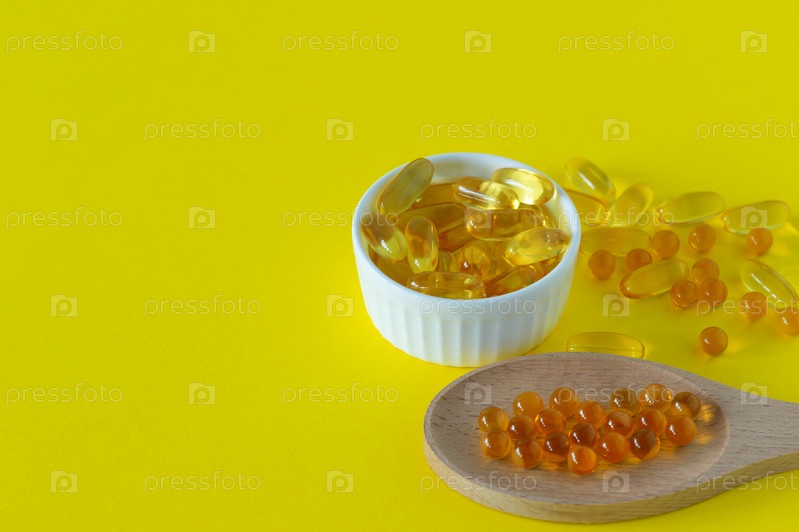 Капсулы с рыбьим жиром на желтом фоне, витамин D, омега-добавка, селективный фокус