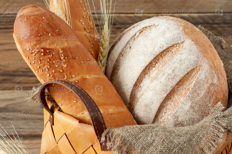 Состав различных хлебобулочных изделий в корзине на деревенском фоне. Домашняя свежая выпечка