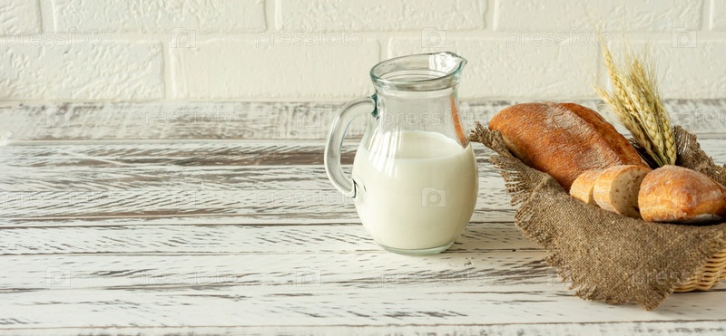 Нарезанный ржаной хлеб на деревянной разделочной доске рядом с кувшином с молоком. Вкусная еда крупным планом. Домашний хлеб