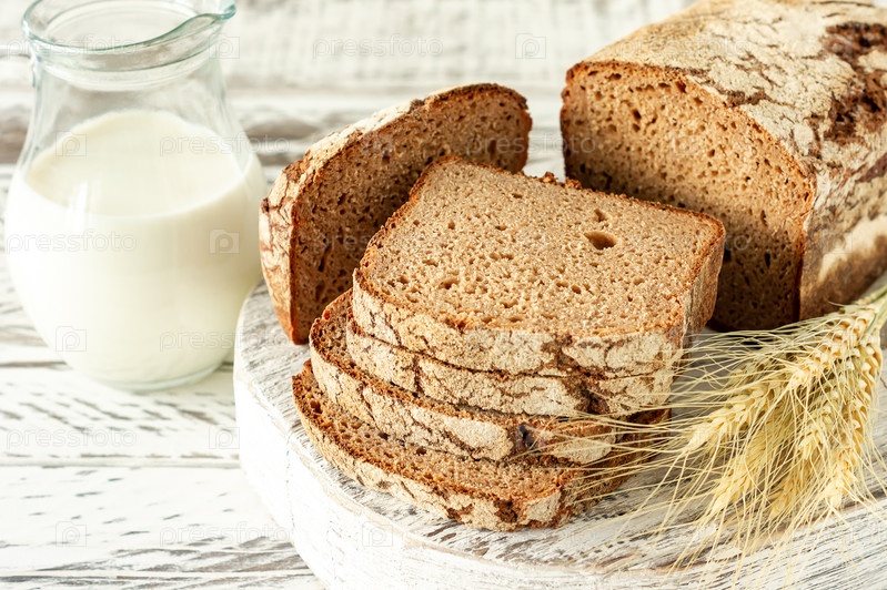 Нарезанный ржаной хлеб на деревянной разделочной доске рядом с кувшином с молоком. Вкусная еда крупным планом. Домашний хлеб