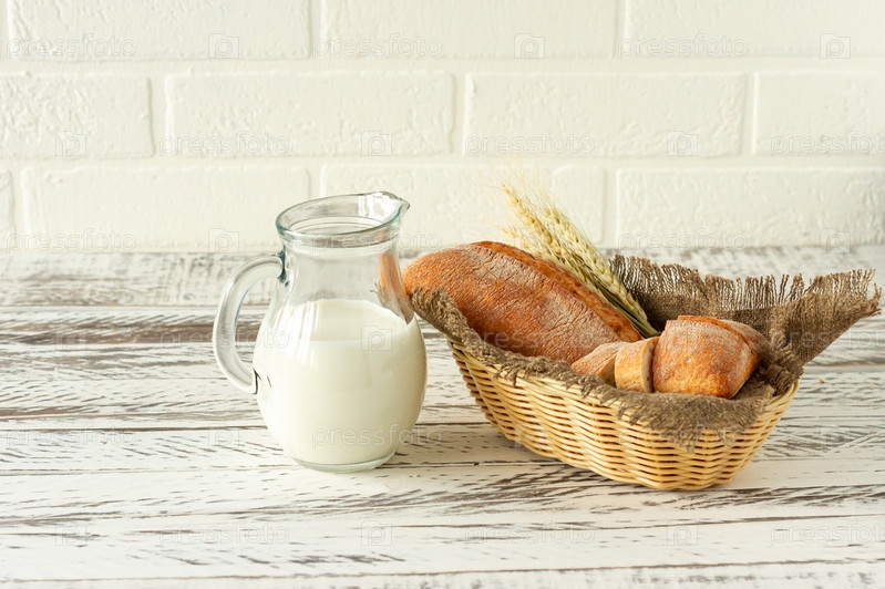 Состав различных хлебобулочных изделий в корзине на деревенском фоне с кувшином молока. Домашняя свежая выпечка
