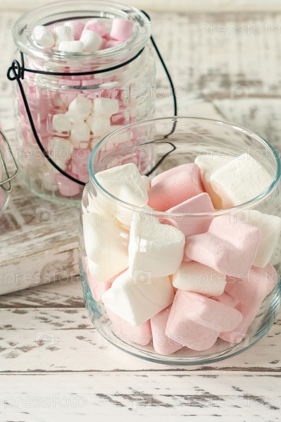 Белый и розовый зефир для жарки и горячего шоколада в мисках, крупным планом. Концепция фона зимней еды