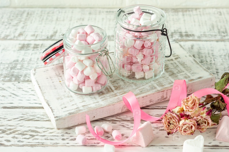 Белый и розовый зефир для жарки и горячего шоколада в мисках, крупным планом. Концепция фона зимней еды
