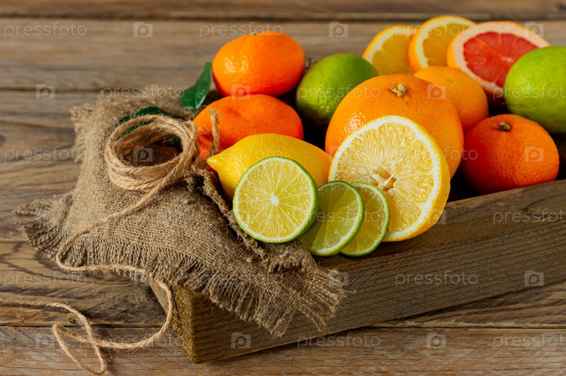 Ассорти из цитрусовых в деревянной коробке. Апельсин, мандарин, грейпфрут, лимон и лайм. На деревянном фоне
