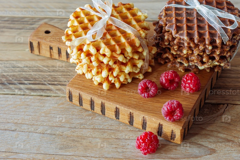 Горячие бельгийские вафли с малиной на разделочной доске