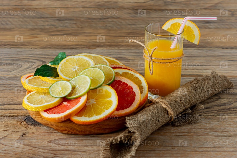 Стаканы сока и цитрусовых на деревянном столе. Деревенский стиль