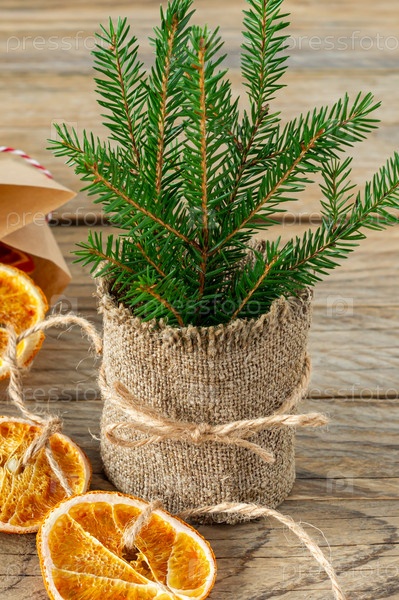 Рождественская композиция с еловыми ветками и гирляндой из сушеных ломтиков апельсинов на деревянном фоне. Деревенский стиль