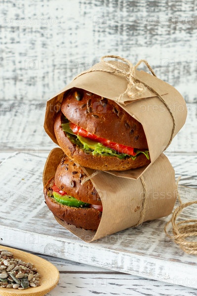 Здоровый бургер из лосося с авокадо и помидорами подается в крафт-бумаге на деревянном фоне