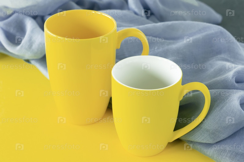 Две желтые чашки на сером и желтом фоне. Цвета 2021 года