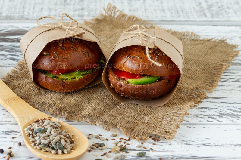 Здоровый завтрак - бургер с копченым лососем, листьями салата и авокадо, который подается в крафт-бумаге на деревянном фоне, горизонтальный