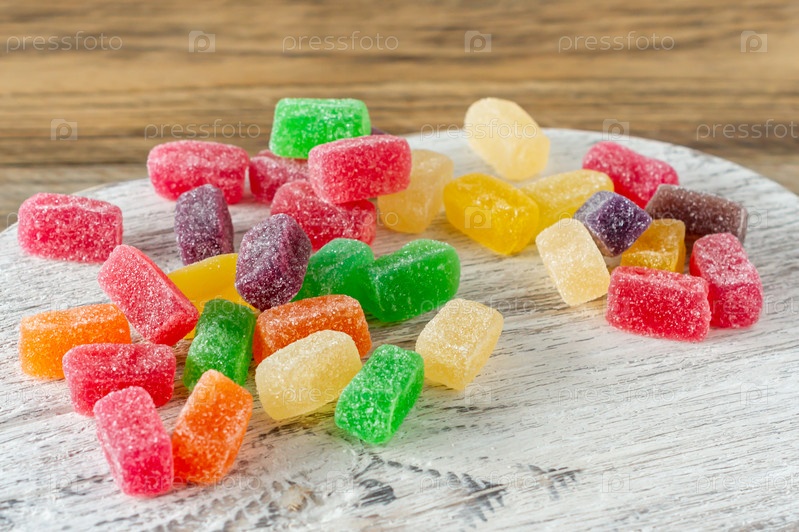 Ассортимент жевательного мармелада разных цветов на деревянном столе. Вкусные траты для детей. копировать пространство