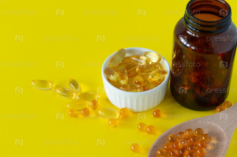 Капсулы с рыбьим жиром на желтом фоне, витамин D, омега-добавка, селективный фокус