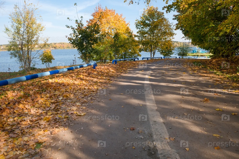 Сельское шоссе, усыпанное кленовыми листьями в осенний день