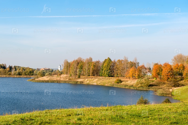 Красивый красочный лес у озера в осенний день