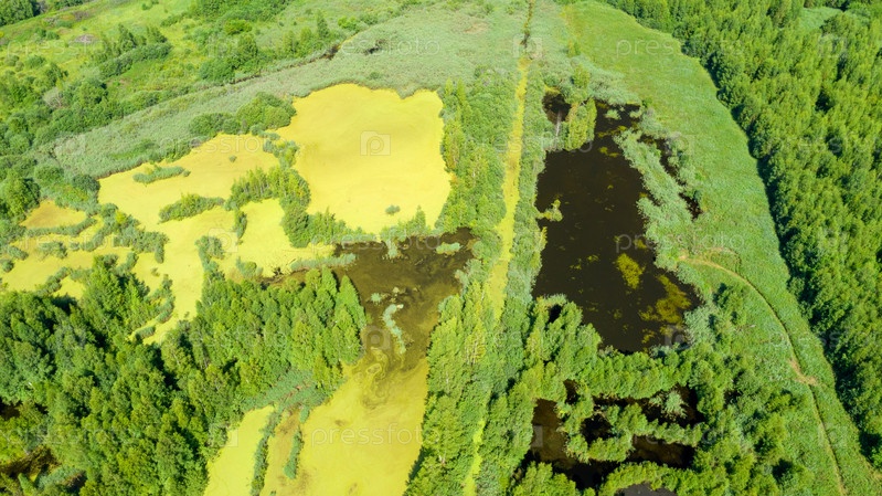 Вид с воздуха на болото в лесу в летний день