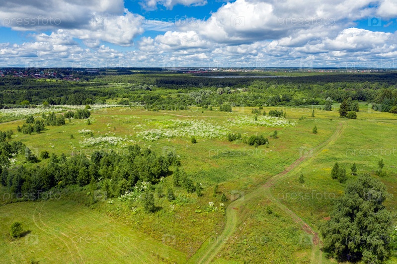 Вид с воздуха на проселочную дорогу через поля и леса