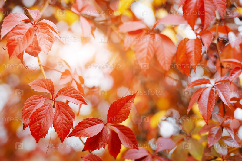 Осенний фон с красочными красными и желтыми листьями вьюнка с размытым свободным пространством