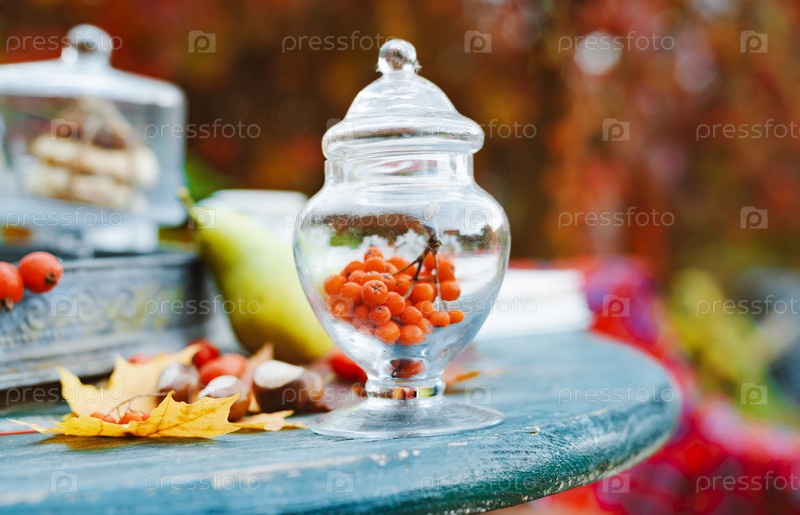 Осенняя концепция. На столе чашка из стекла с рябиной и осенними листьями на заднем дворе
