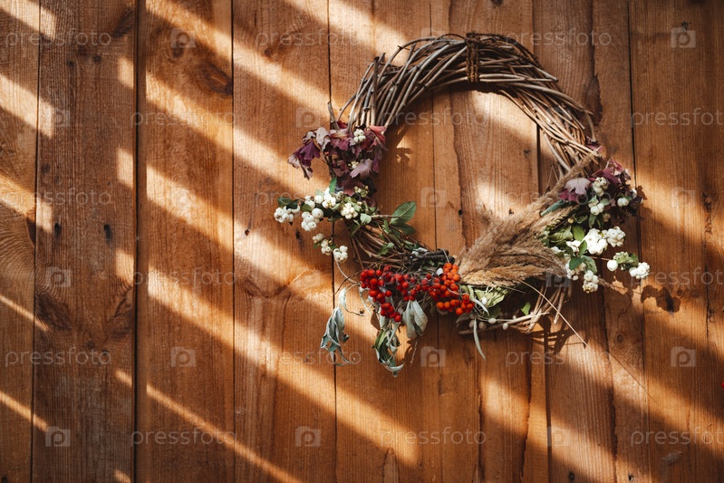 Декоративное дизайнерское окно на террасе. осенний венок и тыквы винтажный старый комод на деревянном деревенском фоне. осенняя композиция и зона отдыха луч солнца