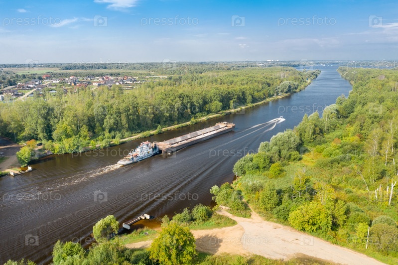 Вид сверху на водный канал и движущуюся баржу