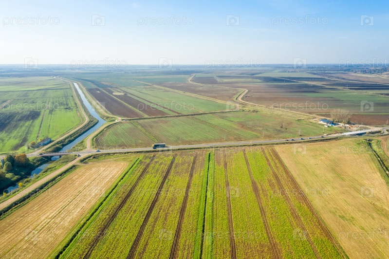 Вид сверху на сельскохозяйственные поля в осенний день
