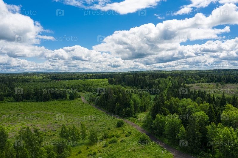 Вид с воздуха на проселочную дорогу через поля и леса
